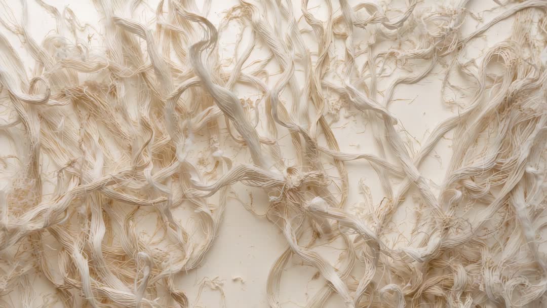AI Generated Image. Video frame showing tangled natural fibers settling across soft neutral backing after slight camera shift, capturing frayed ends and delicate strands in macro detail. High-resolution macro motion study providing close-up texture for textile, craft, packaging, branding projects. Suiting background video loops, product hero banners, blog headers, social media reels, educational tutorials on fiber processing, and abstract motion graphics. Color palette featuring warm beige and off-white tones, creating calm organic mood for lifestyle branding and interior decor concepts. Tip: pair with minimalist typography, soft ambient music, slow crossfades to enhance tactile feel and artisanal craftsmanship narrative.