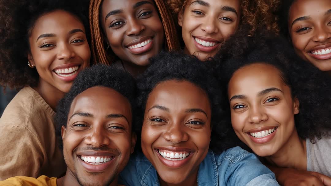 AI Generated Image. Clip showing seven friends leaning in and smiling for selfie while smartphone camera capturing close-up group moment. Faces filling frame, genuine laughter and warm expressions creating inviting, authentic mood. Casual clothing and natural light supporting relaxed, friendly atmosphere. Use for social media campaigns, lifestyle blogs, app promos, friendship articles, event promotions, diversity and inclusion content, and community outreach. Editing tips: crop for square or vertical formats, add upbeat music and bold overlay text, apply warm color grading to enhance skin tones, keep focus on faces for thumbnails. Ideal for hero banner loops, website headers, mobile ads, YouTube intros, and email marketing promos seeking human connection and joyful energy.