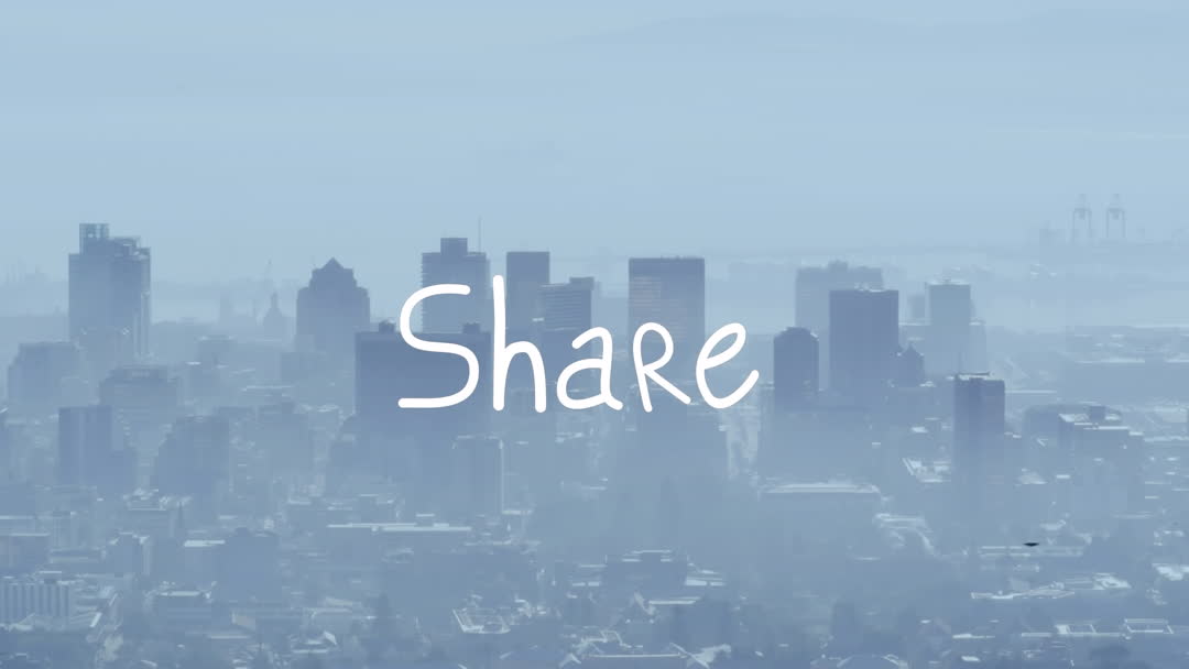 Text overlay of 'Share' on an aerial view of a city skyline. Atmospheric orientation of interconnected networks. Suitable for promoting collaboration, content sharing initiatives, or digital connectivity themes. Useful in business presentations, corporate communications, or digital marketing materials to emphasize network building.