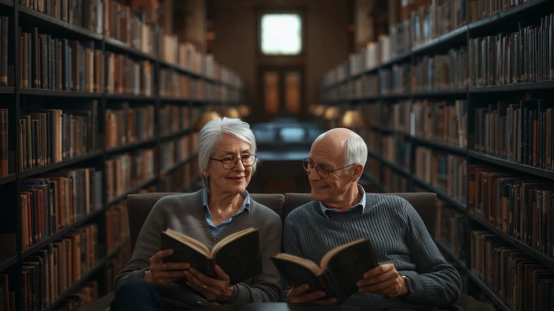 AI Generated Image. Two seniors sitting side by side on library armchairs, reading hardcover books and exchanging warm smiles while lifting heads to share a glance. Shot framed down long aisle with symmetrical shelves, warm lamp light, and soft background bokeh creating intimate cinematic feel. Footage working well for library promotions, retirement community marketing, adult education campaigns, book club promotions, healthcare lifestyle content, and documentary B-roll. Clip providing gentle, optimistic mood for website hero banners, social media posts, corporate presentations, and print editorial spreads. Visual elements featuring cozy textiles, vintage hardbacks, and subtle window backlight that support themes of companionship, lifelong learning, and peaceful leisure.