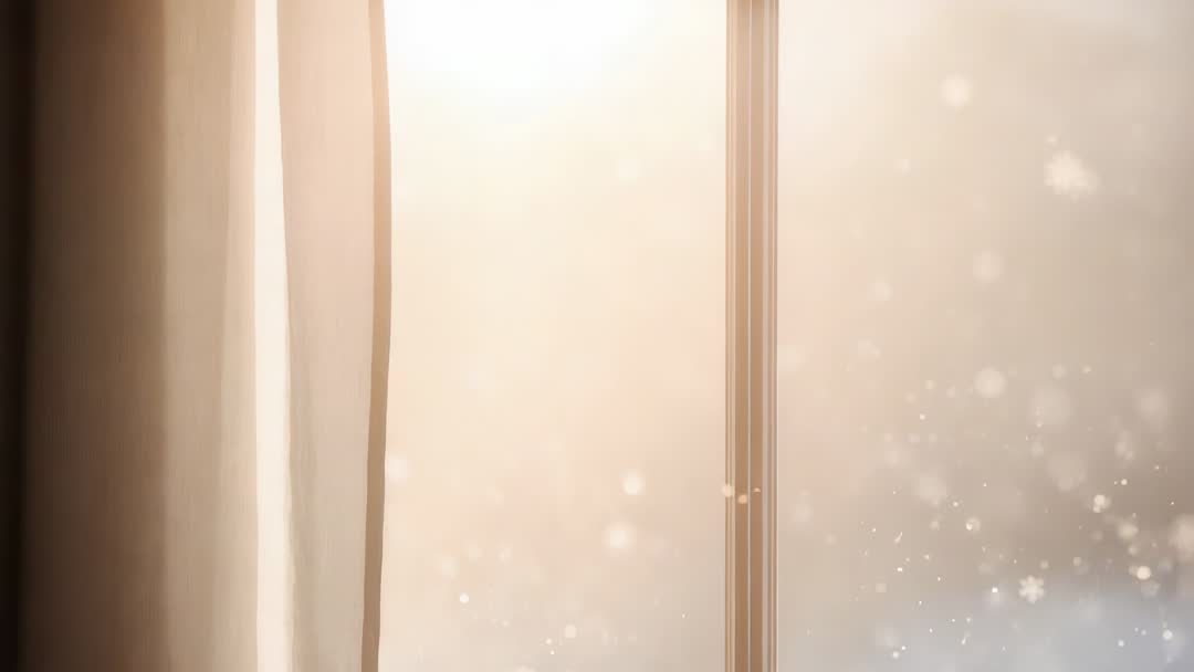 AI Generated Video. Video showing sheer curtain drifting across backlit window while sunlight glowing through falling snow. Soft warm tones and shallow depth of field creating dreamy, calming atmosphere. Footage working well as background for winter lifestyle ads, seasonal social media stories, home decor promotions, wellness and meditation apps. Useful as loopable b-roll for real estate virtual tours, hotel marketing, interior design presentations, holiday greeting cards, and cinematic intros. Compatible with color grading and speed ramping; ideal for slow motion or overlay with text. Neutral composition leaving negative space for copy or logo placement.