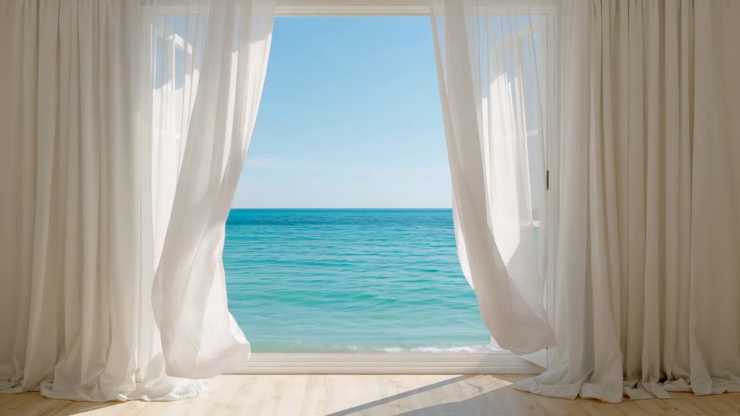AI Generated Video. Video showing sheer white curtains billowing in sea breeze through open sliding doorway, revealing turquoise ocean meeting clear sky at horizon. Sunlight softening wooden floor and casting soft shadows across flowing drapery. Slow motion movement emphasizing calming rhythm of waves and fabric sway, suggesting peaceful morning by sea. Optional ambient sound: distant waves and wind for immersive atmosphere. Use for travel and hospitality promos, wellness and meditation apps, spa and resort marketing, real estate listings for beachfront properties, website hero backgrounds, social media ads, lifestyle editorials, interior design presentations. Recommend looping for calming background, overlaying text or logo for promotional hero, and pairing with ambient audio for atmospheric video headers or relaxation content.