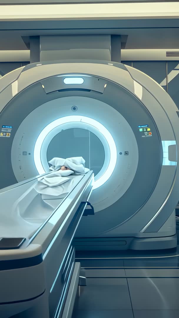 AI Generated Image. Video showing sheeted patient moving into lit MRI bore while motorized table sliding forward. Soft blue LED ring lighting creating calm clinical atmosphere and highlighting modern scanner design. Scanner control panels displaying status lights and icons, offering authentic radiology environment. Vertical format optimizing mobile and social platform use, portrait aspect ideal for Instagram Reels, TikTok, vertical ads and stories. Usage ideas include hero background for radiology clinic website, B-roll for medical training videos, patient education clip explaining MRI process, marketing content for imaging centers, news segment B-roll and stock footage library. Shot composition offering centered bore symmetry, gentle table motion, sterile surface details and high-contrast ring illumination for cinematic medical visuals.