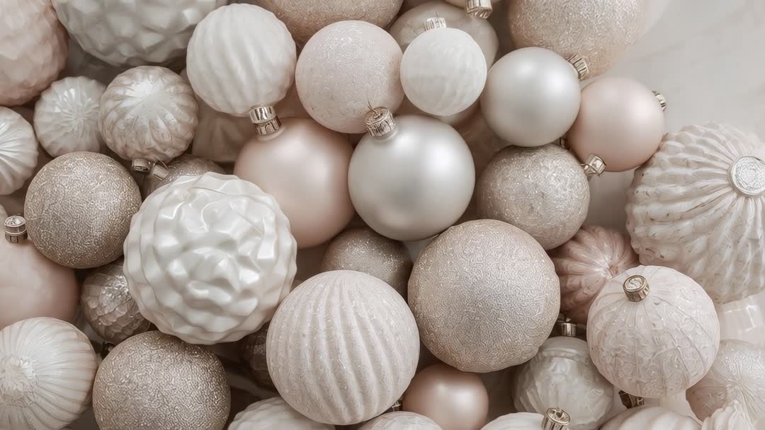 AI Generated Video. Showing slow camera shift over dense pile of pastel cream and blush baubles with pearlescent, glitter, glossy and matte finishes. Highlighting rich variety of textures including ribbed, embossed, frosted and satin surfaces catching soft light. Working well for holiday marketing, social media reels, website banners, email headers, product packaging and store window animations. Serving as short 3-6 second loop for background or hero content, or as close-up b-roll for lifestyle and e-commerce videos. Offering neutral elegant mood for luxury brand campaigns, wedding decor promotions, interior design editorials and seasonal greeting animations. Suggesting edits such as slow speed ramping, warm color grade, subtle vignette and overlaying text or logo on negative space along edges.