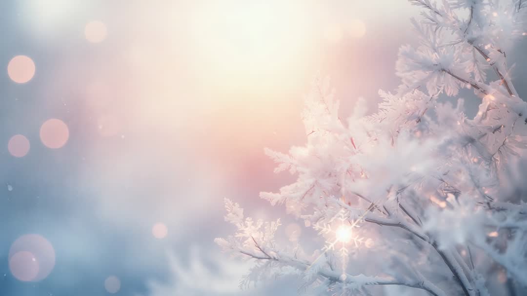 AI Generated Video. Video clip showing frosted branch close-up with falling snow, pastel bokeh, and warm sunrise glow, left side providing ample copy space for headlines and logos. Footage featuring shallow depth of field, soft lens flares, and delicate sparkle on frost, creating dreamy winter atmosphere. Use for holiday banners, seasonal website headers, social media hero images, greeting card animations, product commercials, atmospheric title backgrounds, or nature documentary openers. Layering suggestions include gentle slow zoom, light leak overlays, subtle particle animation, and text lower thirds to enhance cinematic impact. Color palette blending cool blues with warm pink and peach highlights, suitable for wellness, travel, lifestyle, and holiday campaigns.