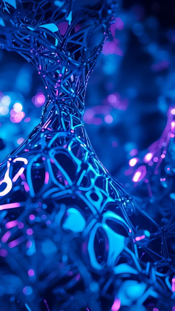 AI Generated Image. Footage is showing shifting camera revealing glossy porous mesh bathed in cyan and magenta neon glow, tight depth of field producing soft bokeh highlights. Lattice and hourglass forms are creating organic, futuristic texture with high reflectivity and wet-look finish. Visual is working well as vertical video background for tech marketing, electronic music visuals, app hero reels, social media stories, and mobile lock screens. Use as loopable animated backdrop for product reveal, UI demo, event opener, or VJ performance. Editing tips: extend seamless loop by matching first and last frames, add subtle camera push or vignette to emphasize center, overlay clean sans-serif typography in high-contrast color, and experiment with color grading to shift mood toward cool or warm. Color palette is dominated by cyan, magenta, deep indigo; mood is futuristic, mysterious, energetic. File recommendations: vertical 9:16 aspect, high resolution, 24–60 fps depending on desired motion smoothness.