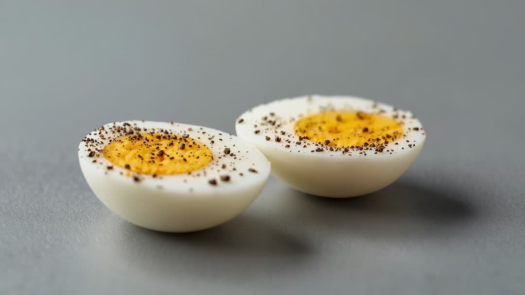 AI Generated Image. Shifting camera revealing two halved hard-boiled eggs sprinkled with cracked black pepper on smooth gray tabletop. Macro framing highlighting creamy yolk texture, crisp white surfaces, and scattered pepper granules with soft bokeh background. Studio lighting creating gentle shadows and subtle highlights for appetizing contrast. Suiting recipe videos, cooking tutorials, breakfast menu visuals, food blogs, nutrition articles, and social media content. Working well for banner headers, square social posts, cookbook spreads, product packaging for condiments or egg-related products, and meal-prep marketing. Offering easy cropping for close-up and widescreen formats while maintaining strong focal point and minimalist aesthetic.
