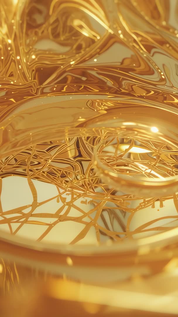 AI Generated Image. Vertical 9:16 loop showing shifting camera movement across reflective gold bowl and tangled filament mesh, creating abstract metallic composition. Smooth camera drifting and shallow depth of field producing cinematic shimmer and soft bokeh. High-gloss surface reflecting studio glow and scattered highlights, generating warm luxury tones. Working perfectly for motion backgrounds, luxury brand promos, jewelry and fashion advertising, title intros, social media reels, product packaging visualization, website hero loops, broadcast idents. Easy to loop and color grade for brand fit. Close-up detail of wire filament and molten-like surface offering texture element for motion graphics, abstract design projects, and editorial visuals.