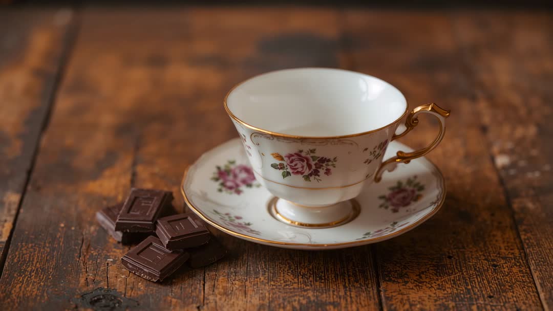 AI Generated Image. Camera shifting to focus on delicate porcelain teacup with gold rim, resting on matching saucer beside stacked dark chocolate squares on weathered wood surface. Soft warm lighting creating cozy, elegant mood while shallow depth of field blurring background for cinematic look. Footage working well for tea brand promos, confectionery packaging, food blog intros, cafe social media, product hero shots, lifestyle commercials, seasonal advertising, and editorial content. Composition allowing overlay text and logo placement over blurred background while close-up frames supporting slow-motion reveal or stop-motion editing. Generous negative space on right providing room for headline, product name, or call-to-action. Color palette featuring warm browns, cream tones, muted pinks, and gold accents for vintage, luxurious mood.