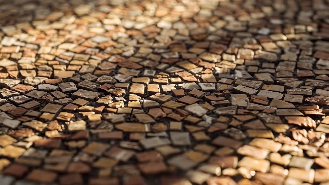 AI Generated Image. Video showing shifting canopy shadows sweeping across sunlit mosaic paving with dark grout, captured in shallow depth of field. Warm earth tones and soft bokeh creating meditative, rhythmic motion while irregular ceramic tiles and chipped edges add tactile character. Close-up composition emphasizing repeating pattern and contrast between light and shadow. Useful for architectural b-roll, travel films, urban design presentations, background loops for websites, social media reels, or ambient video installations. Clip looping smoothly for seamless background use. Editors pairing clip with slow ambient music or nature sounds for calming transitions. Ideal for design mockups, product overlays, printed textures, film title sequences, and editorial spreads.
