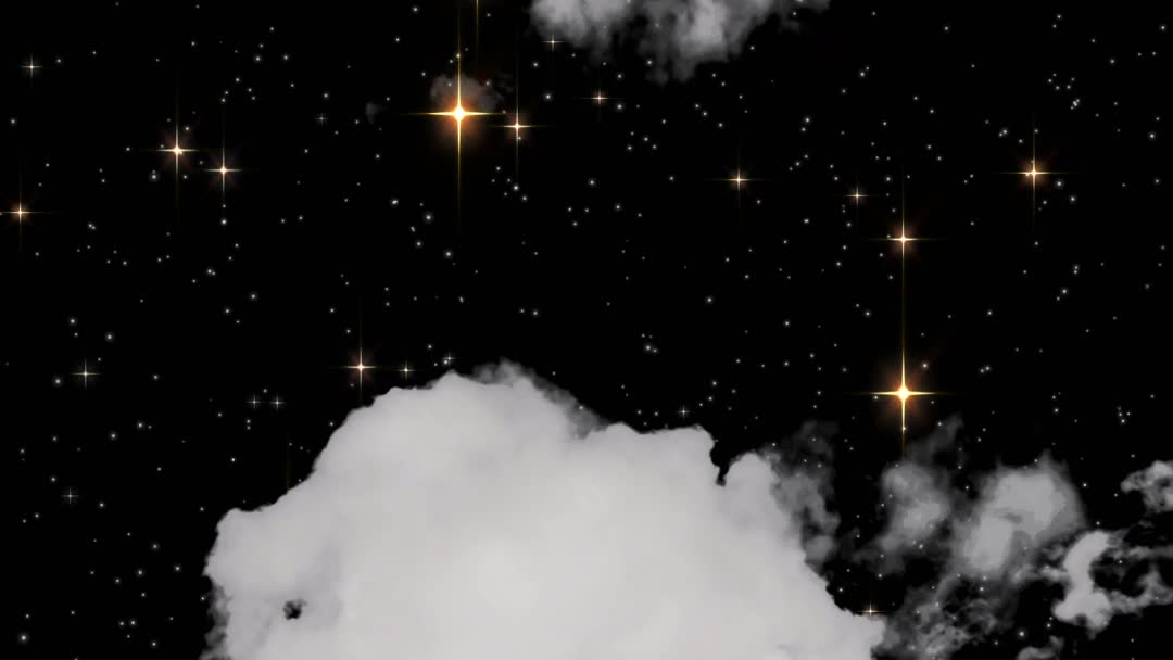 Shifting cloud drifting upward while wispy top tendrils thinning, revealing dense starfield dotted with twinkling points and warm golden cross flares. High-contrast night sky composition blending soft nebula-like cloud motion with crisp stellar flares, creating cinematic ambient mood and slow, hypnotic movement. Footage working as looping background for meditation apps, sleep aid videos, ambient music visuals, film title sequences, website hero banners, social media reels, planetarium displays, or event projection. Color palette balancing deep ink-black sky with warm gold highlights, enabling easy color grading and overlaying text or logos. Ideal for evoking calm, wonder, or cosmic mystery, and for use in educational astronomy segments, sci-fi storytelling, holiday card animations, or mindfulness promos. Providing smooth motion suitable for seamless loops, HD and 4K projects, and cross-platform digital campaigns.