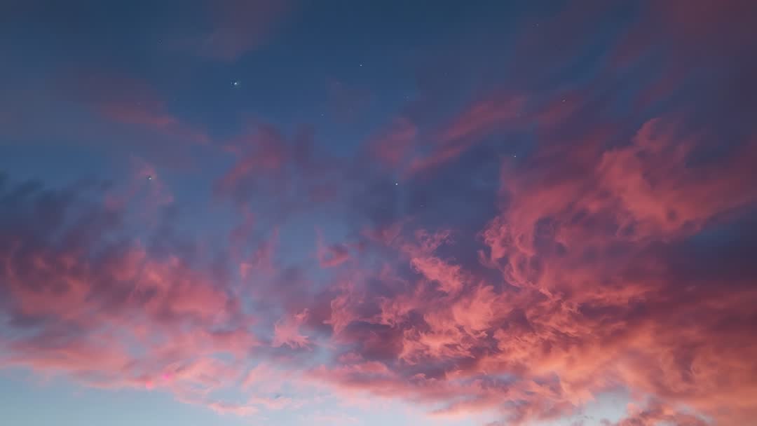 AI Generated Video. Footage showing shifting crimson and pink cloud bank at dusk, blending into deep indigo sky while bright star appearing near horizon. Camera holding steady with gentle motion for cinematic atmosphere and slow reveal. Colors transitioning from warm magenta to cool blue, creating rich gradient ideal for cinematic intros, meditation backgrounds, weather segments, nature documentaries, travel promos. Footage working well as hero header for websites, social media reels, screen savers, digital signage, desktop wallpapers, greeting cards, and fine art prints. Useful for illustrating concepts such as transition, hope, solitude, evening calm, and celestial events. Provide ample negative space for overlay text, logos, or lower third graphics. Recommended editing tips: apply subtle slow zoom, enhance color contrast, loop short segment for ambient background, or combine with soft ambient music for calming video sequences.