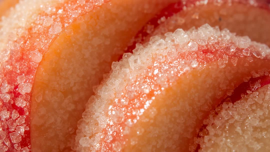 AI Generated Image. Shifting macro clip revealing coarse sugar crystals sparkling on sliced peach flesh, showcasing contrast between crystalline texture and soft fruit surface. Featuring warm peach tones, shallow depth of field, tight composition, and glistening highlights. Offering versatile footage for food commercials, recipe videos, social media reels, website hero banners, cookbook inserts, product packaging, and culinary editorial. Serving well as looping detail shot, slow-motion transition, or background texture for text overlays. Suggesting color grading toward warm, saturated hues and cropping to landscape or square formats for social platforms. Leaving negative space along left edge for headline or logo placement.
