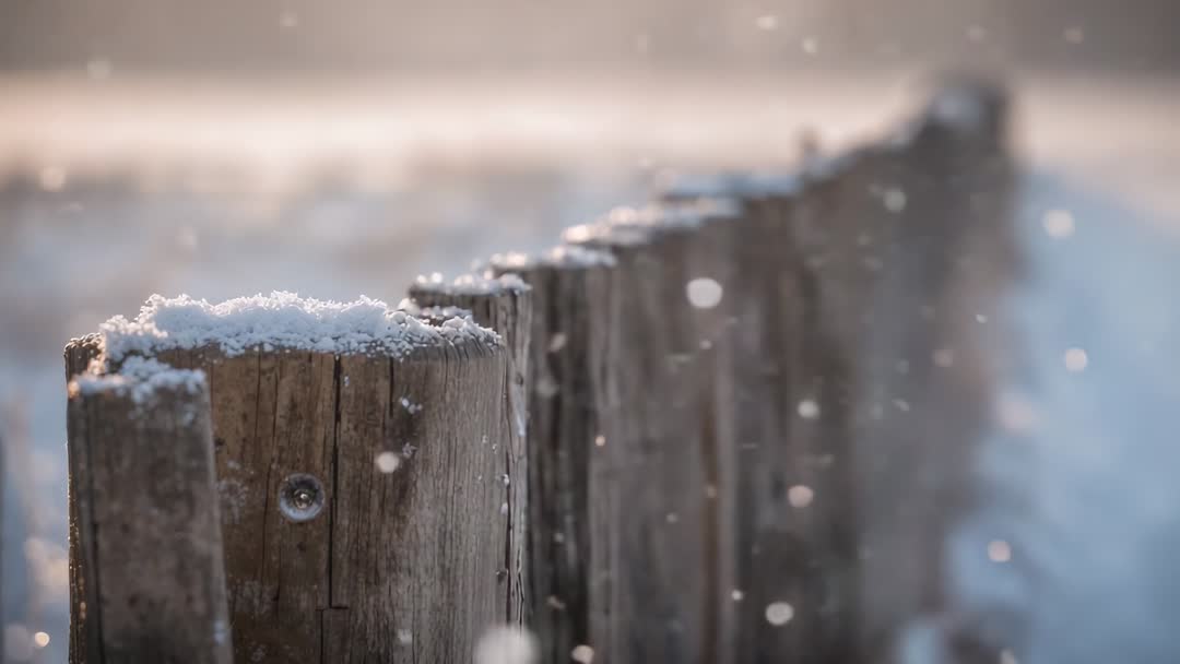 AI Generated Video. Video clip showing close-up tracking shot along weathered wooden fence topped with fresh snow. Camera shifting focus from nearest post toward receding line, revealing screw detail and wood grain while snowflakes drifting through warm backlight create soft bokeh orbs. Muted winter palette and shallow depth of field producing cinematic, atmospheric mood. Usage ideas: Use for website hero background during seasonal promotions, place text overlay in left negative space for headlines, use as opening shot for travel or nature film, include in social media reels and mood pieces, pair with ambient sound or gentle piano for winter greeting or product ad. Clip looping well for shop displays and storefront screens. Technical notes: Recommend color grading toward warm highlights and cool shadows, apply gentle slow zoom or pan to enhance motion, keep focus rack small to maintain soft bokeh. Suitable formats: 4K or HD video, 24-60 fps, short loop.