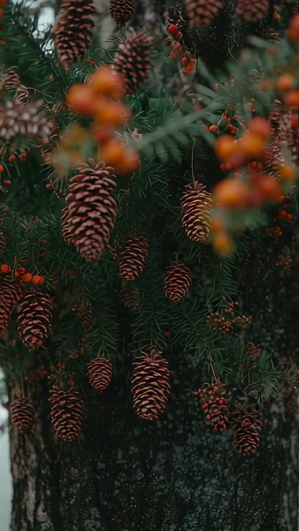 AI Generated Video. Vertical nature video shifting focus from hanging pine cones to clusters of red berries while panning across rough pine bark. Slow reveal of texture through shallow depth of field and foreground bokeh, creating intimate seasonal mood with deep greens and warm browns. Camera movement showing gradual focus pull between foreground berries and midground cones, ending on textured trunk. Ideal for use in seasonal social media reels, vertical ad creatives, mindfulness or wellness backgrounds, nature documentary inserts, holiday product promotions, and website hero banners. Footage working well as looped ambient clip for lobby displays, retail signage, or digital screens. Editing suggestions include adding soft piano or ambient pad music, overlaying subtle animated titles, applying gentle color grade toward cooler tones for winter or warmer tones for autumn, and trimming for 15-30 second social formats.