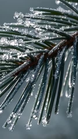 AI Generated Video. Vertical macro video showing frosted pine needles with delicate ice beads and shifting focus for cinematic depth. Captured in 9:16 format with shallow depth of field, cool color palette and soft bokeh background, providing tactile detail and moody winter atmosphere. Working well as mobile background, Instagram Reels, TikTok clip, Stories, vertical ad or screensaver. Serving as b-roll for nature documentaries, weather segments, forestry content, seasonal marketing and environmental campaigns. Using slow pans or gentle rack focus enhances texture and sparkle of ice crystals, while looping or slow motion emphasizes calming, meditative mood. Recommending subtle color grading to preserve cool tones and increasing contrast to highlight crystalline droplets for commercial or editorial use.