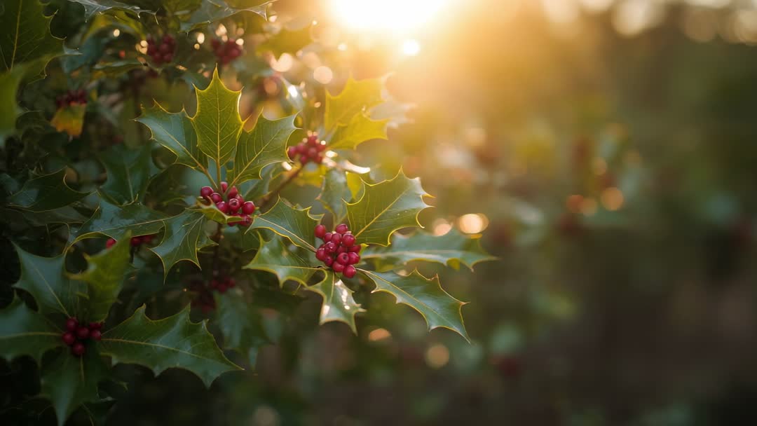 AI Generated Video. Short video clip showing shifting focus from soft background to crisp holly branch during golden hour. Camera panning gently while sunlight backlighting glossy leaves and red berries, creating warm bokeh and shallow depth of field. Footage working well for holiday marketing, seasonal social media, website hero banners, nature documentaries, calming B-roll, greeting card animations, and product overlays. Color palette offering warm golds and deep greens fitting festive or natural themes. Clip adaptable for slow-motion edits, looped backgrounds, layered video compositions, and close-up transitions.