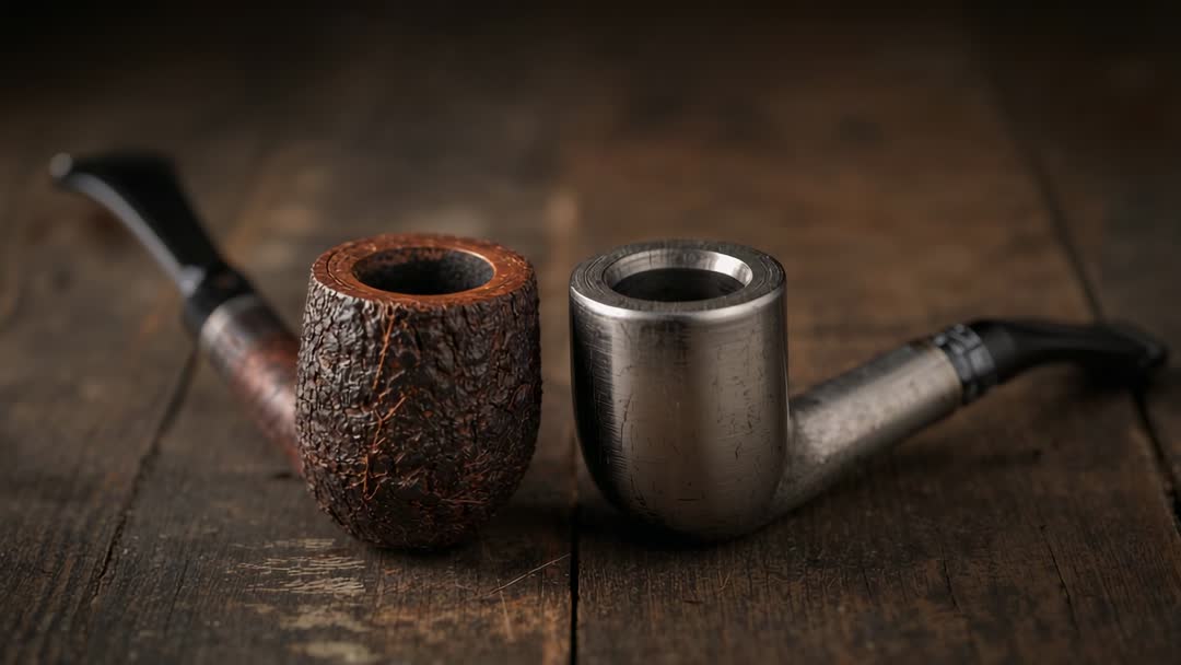 - Shifting Focus Revealing Paired Briar and Metal Smoking Pipes on Rustic Wood Tabletop