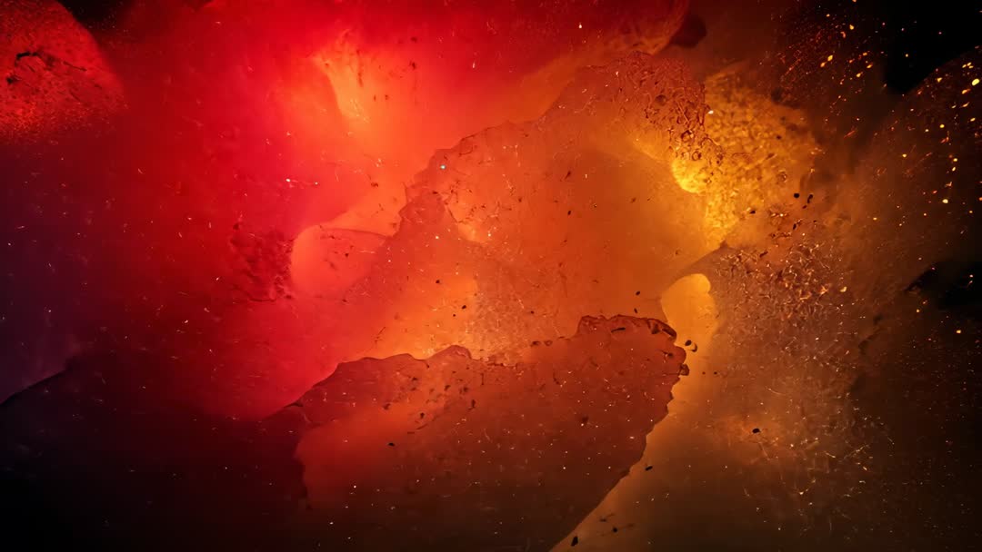 AI Generated Image. Macro video showing vivid pigment clouds moving and blending in liquid, with warm red and orange tones converging into bright yellow core. Fine droplets and suspended particles catching backlight and creating sparkling highlights, producing sense of depth and motion. Suiting motion backgrounds, title intros, music visuals, product advertisements, science and technology sequences, and abstract art installations. Working well with looped playback for ambient visuals and live VJ performances. Offering cinematic color and rich texture for editorial, commercial, or creative projects seeking dramatic organic motion.