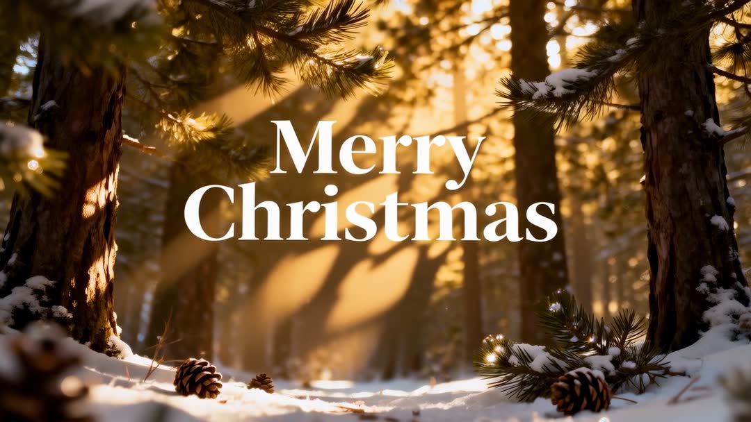 AI Generated Video. Video showing shifting golden sunbeams moving through snowy pine forest while dolly shot gently nudges forward. Foreground showing pine cones resting on snow and pine branches catching warm light. Centered Merry Christmas text appearing over soft bokeh and long sun rays. Mood conveying warmth, serenity, peaceful winter morning. Use for holiday greeting video, social media reel, e-card background, website hero loop, retail signage, seasonal ad, charity appeal, or corporate greeting. Works well as short loopable clip for banner backgrounds or animated card headers. Recommended duration 8-20 seconds, resolution 4K, frame rate 24-30fps. Suggested audio pairing soft piano, tinkling bells, or ambient forest sound. Suggest color grade warmer tones and gentle vignette to increase focus. Leave space below centered text for logo or custom message.