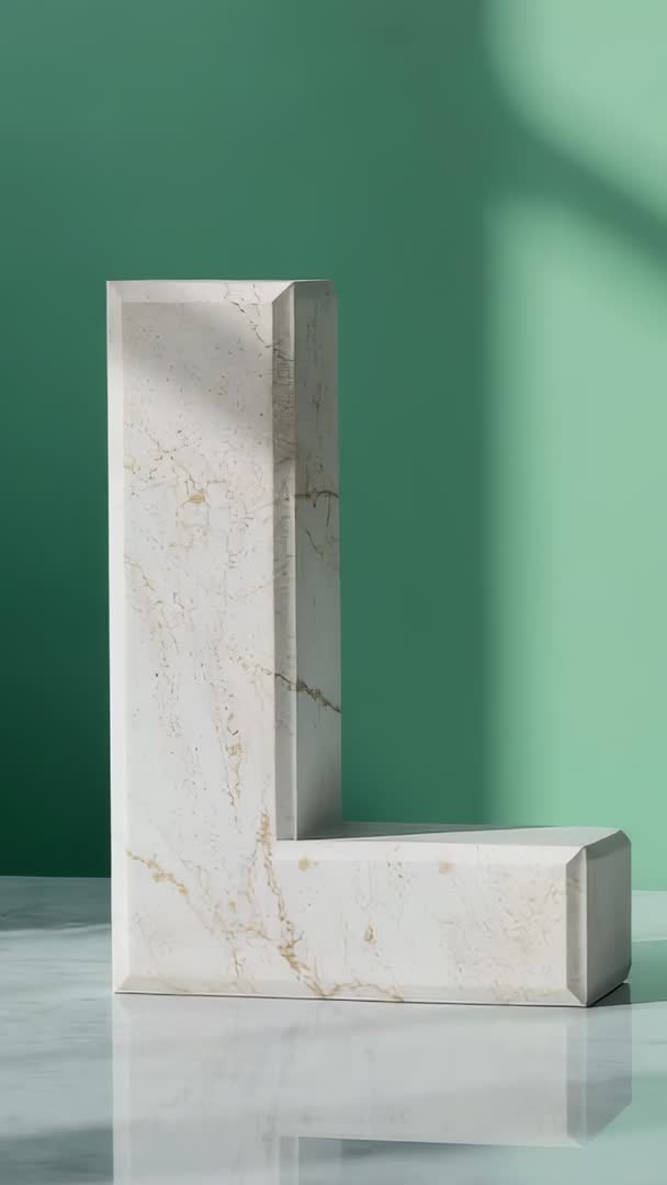 AI Generated Image. Showing marble L sculpture standing on reflective marble floor against muted green background, with shifting natural light casting soft chiaroscuro shadows across surfaces. Veined marble texture and crisp geometric edges creating refined modern aesthetic and subtle tonal shifts. Working well for luxury branding, product reveal, typography animation, motion graphics, social media vertical ads, website hero videos, interior design promotion, architectural visualization. Providing room for text overlay and logo placement in negative space, with consistent color palette and mood lighting supporting upscale look. Serving editors and designers needing minimal, elegant visuals for campaigns, reels, store displays, presentation intros, or portfolio showcases.