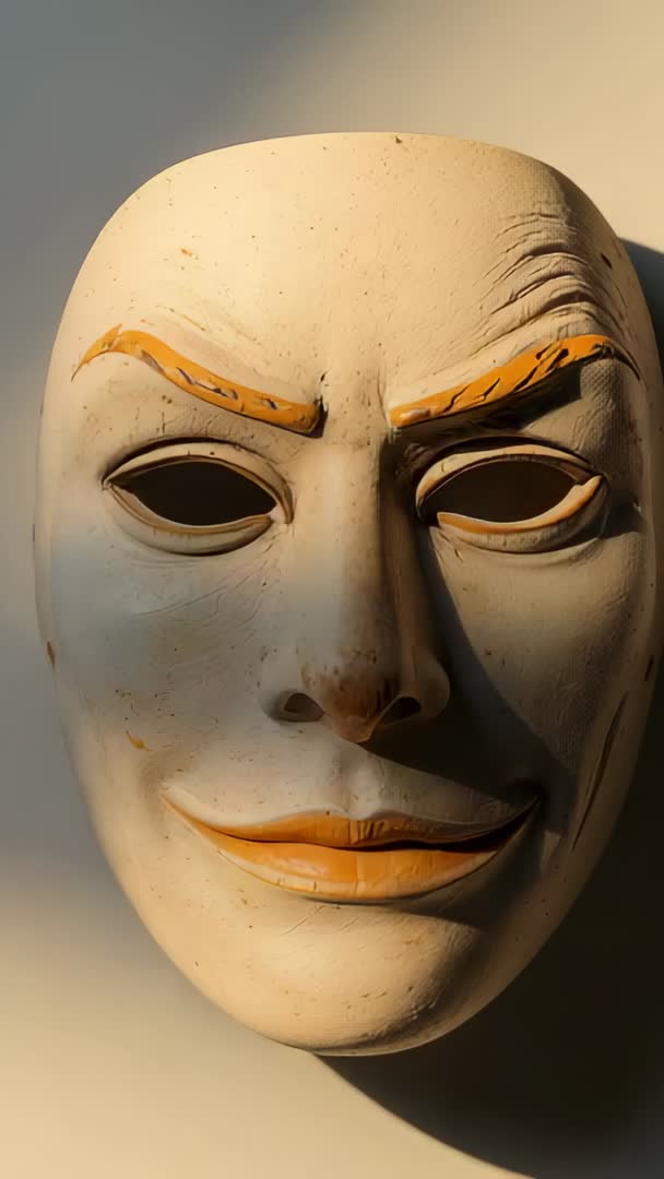 AI Generated Image. Shifting light sweeping across painted plaster mask, revealing textured surface, ochre-painted eyebrows and lips, and deepening sculpted contours with moving shadow. Close-up vertical footage designed for looping, capturing subtle changes in tone and texture as light moves. Warm ochre palette and high-contrast shadow creating dramatic, moody atmosphere. Use for dramatic opener in film or theater trailers, visual backdrop for poetry or music video, atmospheric loop for social media reels and vertical ads, ambient projection in gallery or retail window, and illustrative visual for articles about craft, restoration, or traditional mask work. Suitable for designers seeking evocative texture reference, filmmakers needing uncanny close-up footage, and brands aiming for artful, mysterious mood in vertical format.