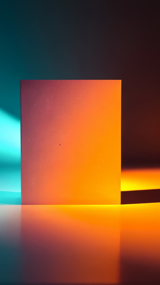 AI Generated Image. Video showing frosted glass square panel standing on reflective surface while teal and orange lights shifting across surface, creating vivid gradient, soft shadow, and warm-cool contrast. Dust specks and subtle texture catching light, adding tactile detail and cinematic mood. Stable vertical framing with strong reflection and clean negative space for overlaying text or branding. Ideal for background for product promo, tech or beauty commercial, social media vertical ad, app intro, motion graphics placeholder, or title card. Perfect for overlaying logo, headline, or lower-third graphics; looping footage for ambient hero banner or short-form ad. Color palette offering vibrant teal and warm orange contrast, suitable for technology, luxury, wellness, and creative industries. Recommended for minimal typography, glass or neon-themed layouts, or transition element in video edit.