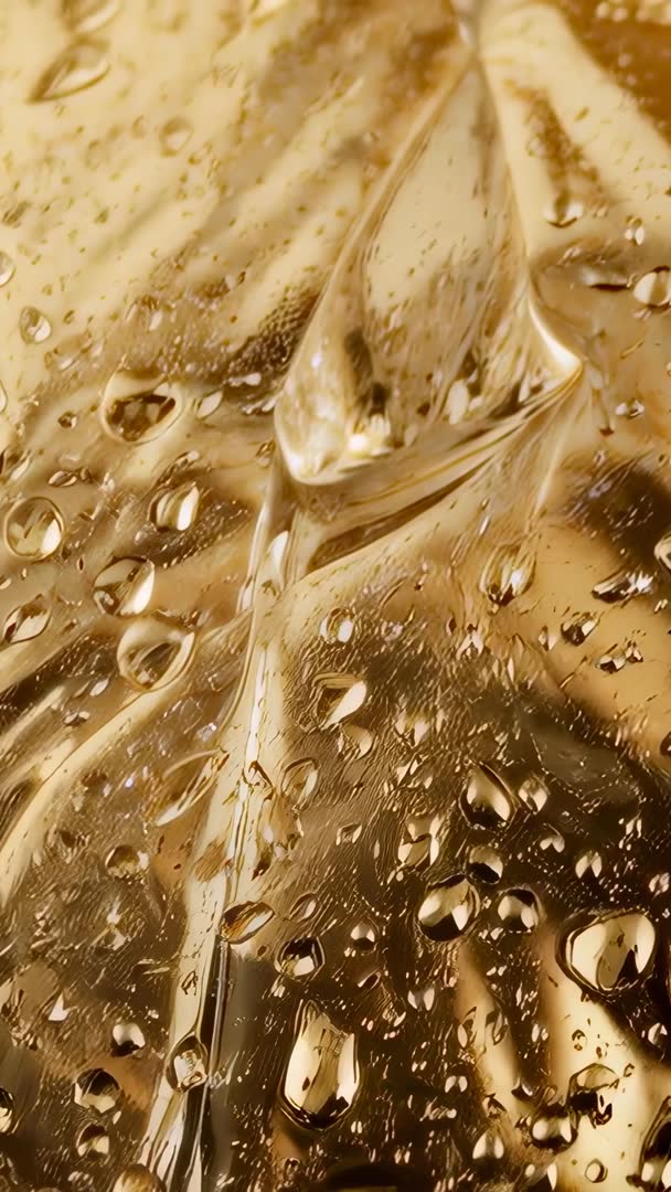 AI Generated Video. Offering rich golden texture and shifting highlights, vertical macro clip capturing close-up creases on foil with scattered water droplets and reflective beads. Slow camera movement and warm studio lighting creating glimmering reflections and flowing abstract patterns. Serving as luxury product background, fashion and jewelry advertising, beauty reel content, social media story clips, and title sequence backdrops. Providing loopable background for mobile hero screens, motion graphics overlays, website header loops, and cinematic transitions. Compatible with vertical platforms Instagram Reels, TikTok, and Snapchat. Allowing color grading and blend mode adjustments for creative overlays with typography and logos. Conveying warm, elegant, tactile mood and abstract sensuality, suitable for premium branding and editorial use.