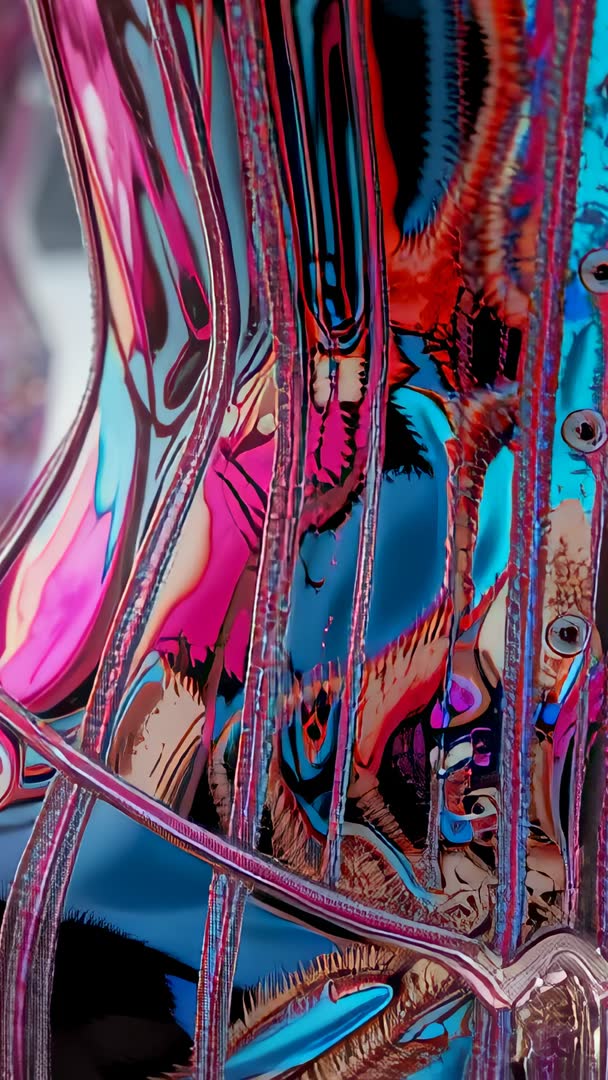 AI Generated Image. Vertical video featuring shifting neon lights moving across rippled chrome surface with visible rivets and high-contrast reflections. Capturing close-up reflective textures intended for smartphone vertical formats and cinematic displays. Conveying futuristic, industrial, dynamic moods through neon magenta, cyan, electric blue, and hot red palette. Delivering high-resolution reflective detail and slow-moving ripples ideal for looped playback. Serving tech product promos, music visualizers, social media vertical ads, title sequences, live event visuals, and fashion or automotive campaigns. Allowing speed ramping, color grading, masking for typography, and overlay blending for custom motion graphics. Pairing well with ambient electronic soundtracks and kinetic typography for immersive brand pieces. Trimming and crossfading enabling seamless loops for background fills and stage projections.