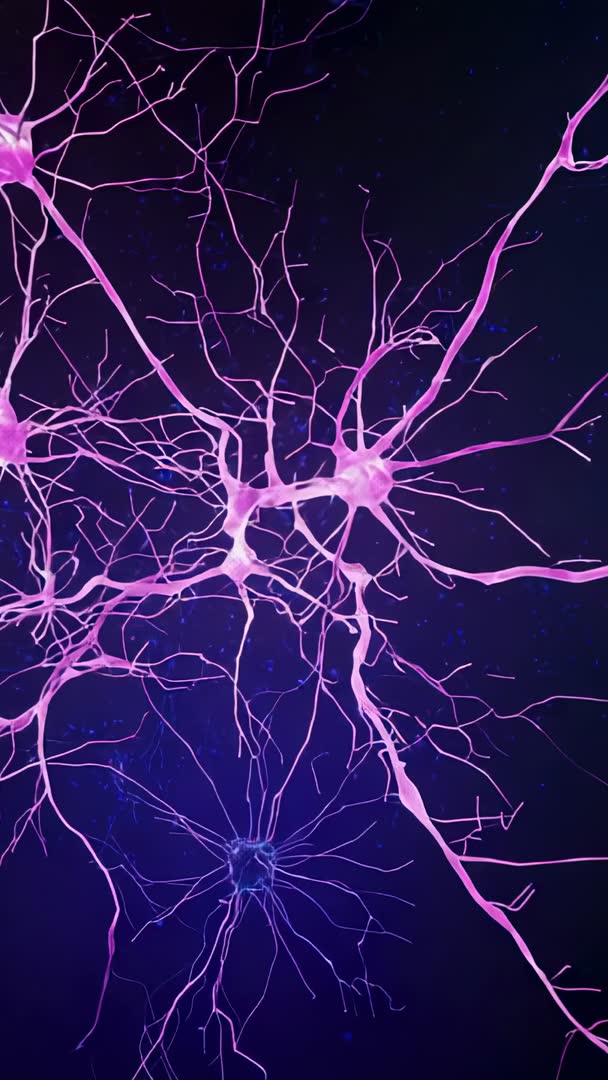 AI Generated Image. Showing shifting neuron activation traveling through pink dendrites and synapses on dark purple background. Highlighting pulsing cellular structures and branching networks, simulating neural signaling and synaptic transmission. Serving neuroscience lectures, medical research presentations, educational explainer videos, technology marketing, science documentaries, and creative motion backgrounds. Providing loop-friendly segment, color-customization presets, and space for overlay text and logo. Suggesting uses such as adding voiceover narration for research summaries, layering infographic labels for educational content, integrating into website hero sections, and using as backdrop for conference presentations. Working well with slow zoom, glow effects, and particle overlays to enhance cinematic mood.