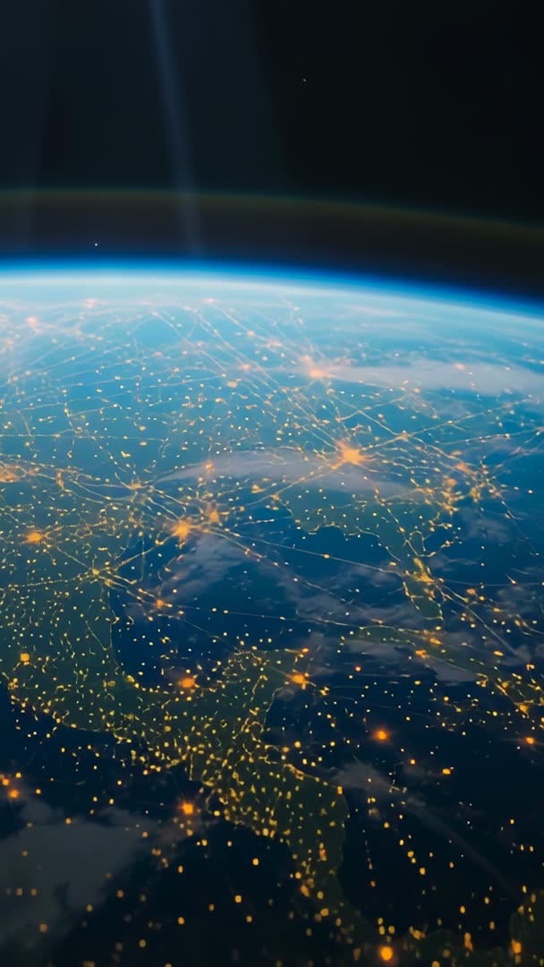 AI Generated Image. Video showing shifting orbital camera sweeping along thin planet limb, revealing illuminated city hubs linking through glowing lines and scattered light points. Composition featuring deep space contrast and vibrant blue atmosphere, creating cinematic backdrop for storytelling. Graphic elements and motion-friendly negative space providing room for overlay text and branding. Suiting corporate presentations about global connectivity, enhancing broadcast opens and title sequences, supporting technology and telecom marketing, and serving as background for mobile and social vertical video campaigns. Working well for documentary segments on urbanization and data networks, product demos for cloud and cybersecurity services, and futuristic or sci-fi projects.