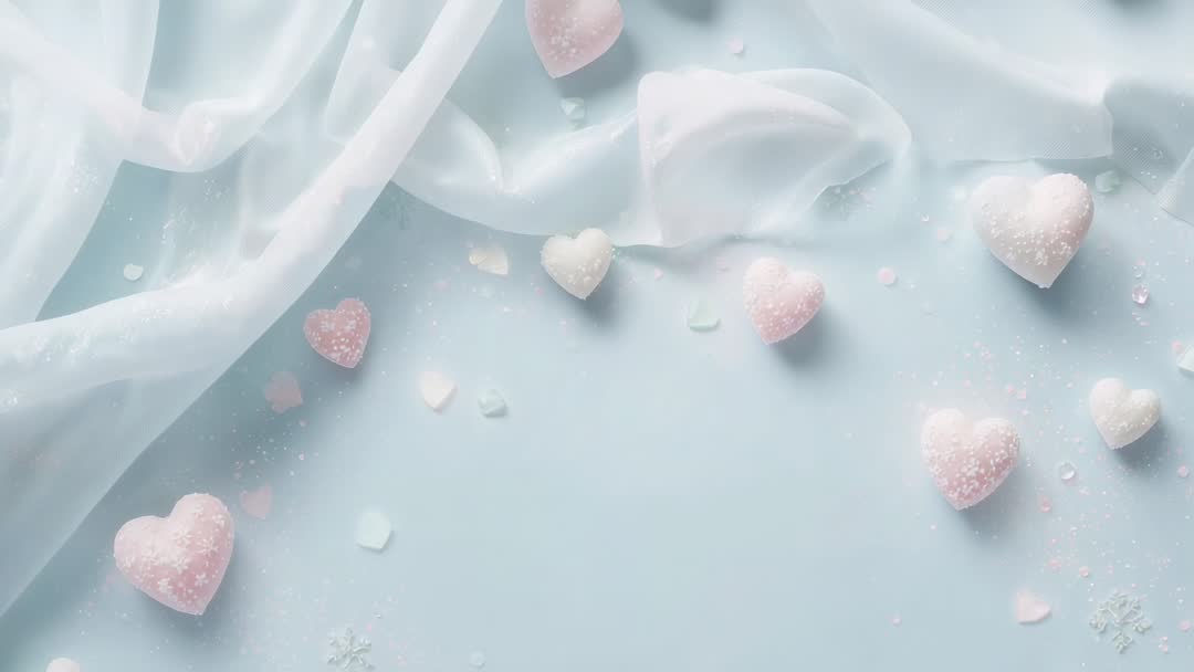 AI Generated Video. Softly shifting overhead composition featuring pastel blue flat surface, drifting sheer fabric, and scattered sugar heart candies dusted with snowflake sprinkles and crystal confetti. Slow cinematic lighting change revealing subtle shadows and highlights, creating gentle movement ideal for loopable video content. Working well for valentine-themed hero banners, romantic social media reels, greeting card animations, wedding invitation loops, confectionery packaging promos, and dessert blog intros. Allowing ample negative space for text overlay, logo placement, or product insertions. Color palette keeping soft pinks and blues, conveying delicate, dreamy mood suitable for seasonal campaigns, engagement announcements, and handmade sweets branding.