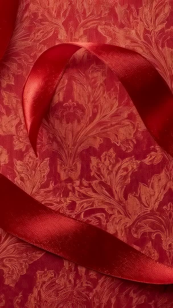 AI Generated Video. Showing shifting red satin ribbon folding into heart-shaped loop over rich damask floral fabric while warm light gliding across silk surface. Close-up vertical video focusing on texture, sheen and graceful motion with deep crimson and gold highlights creating luxurious, romantic mood. Working well for valentine campaigns, romantic product promos, gift wrap tutorials, wedding invitation motion backgrounds, social media reels and story ads. Easily looping for seamless background, matching elegant branding, luxury packaging and floral boutique promotions. Delivering flexible clip for overlaying text, logo reveal, title cards or slow ambient soundtrack.
