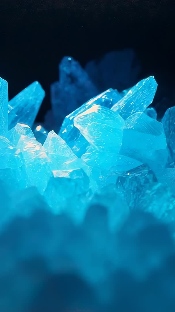 Shifting Reveal of Luminous Blue Crystal Cluster under LED Glow, Vertical Motion Loop Video
