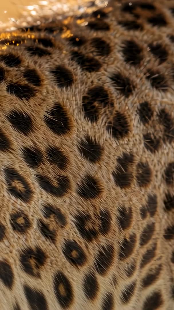 AI Generated Image. Capturing macro vertical footage of shifting rosette fur on leopard flank, revealing soft hairs, spot pattern and warm golden highlights. Tight shallow depth of field producing creamy bokeh and tactile texture, while subtle motion emphasizing lifelike shimmer and depth. Ideal for wildlife documentary interstitials, nature storytelling, television idents, social media reels, fashion moodboards referencing animal print, product backgrounds for luxury brands, textile pattern design references, and museum or zoo exhibit displays. Compatible with vertical-first platforms and looping sequences, allowing seamless short-form usage or slow-motion breakdowns for educational analysis of coat structure.