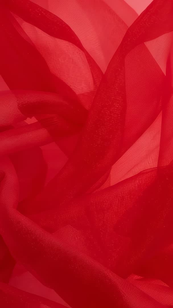 AI Generated Video. Showing sheer red fabric shifting and folding in soft backlight, revealing translucent layers and subtle dark tag. Capturing delicate chiffon texture, flowing folds, and overlapping color depth for cinematic motion. Filming vertically and formatting for mobile and social platforms, loop-friendly composition and even lighting enabling seamless looping and text overlay. Ideal uses: background for fashion reels, beauty ads, romantic campaign visuals, holiday promotions, mood boards, textile marketing, product reveal overlays, title sequences, stage projection. Editing tips: slowing or reversing motion for dramatic effect, adding soft vignette or grain for vintage feel, using multiply or soft light blending to integrate with footage, placing bold white or gold type for high contrast. Color mood: intense crimson warmth, sensual and elegant atmosphere. File note: single vertical clip, medium close framing, soft backlit translucency, visible tag element for authenticity.