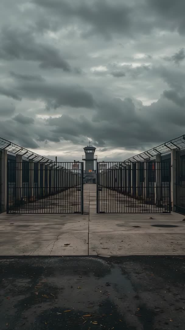 AI Generated Image. Showing vertical cinematic clip of heavy clouds rolling over gated security compound with central watchtower and locked double gate. Highlighting moody lighting, perimeter fence, razor wire details, and wet foreground reflections for dramatic tension. Creating suspenseful, foreboding mood useful for security, detention, restricted access, and surveillance narratives. Suggesting uses: background footage for news segments about lockdowns, B-roll for documentaries on prison or border infrastructure, opening sequence for thriller films, promotional content for security companies, and vertical reels for social media about emergency planning. Recommending slow push-in, subtle time-lapse of cloud movement, or desaturation grading to enhance drama; leaving negative space in upper frame for titles and lower thirds.