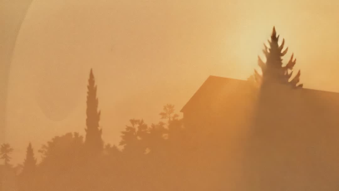 AI Generated Image. Quiet cinematic clip showing sun disk shifting behind rooftop and conifer while warm golden haze fills hillside and lens flare is adding glow. Providing soft backlight and atmospheric depth for establishing shots, travel films, lifestyle commercials, meditation and wellness apps, and social content. Offering generous negative space and balanced composition for title overlays, lower thirds, website hero banners, and editorial layouts. Allowing flexible color grading thanks to warm tones and soft contrast; supporting slow-paced montages and mood-driven storytelling.