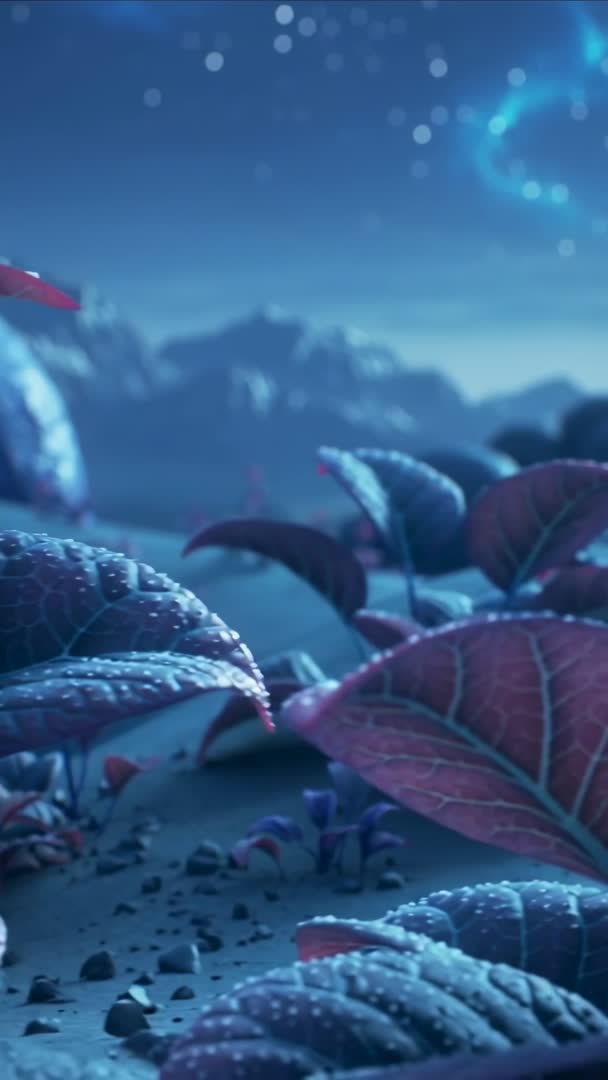 AI Generated Image. Shifting camera moving slowly over moonlit purple foliage, centering on leaf edges glistening with dew under starry nebula sky. Foreground showing macro leaf texture and water droplets catching soft bokeh highlights and cool moonlight. Background featuring distant mountain silhouette and faint constellation ring, creating cinematic depth and otherworldly mood. Color palette leaning toward blue-purple tones, offering dreamy, surreal atmosphere. Serving as vertical background for social media reels, mobile ads, meditation and sleep apps, sci-fi trailers, product showcases, title sequences, and music video overlays. Supporting text overlays, logo reveals, slow parallax effects, and loopable ambient loops for web landing pages or presentation backgrounds. Recommended technical specs: 9:16 vertical aspect ratio, slow dolly or rack focus, macro lens, shallow depth of field, clip length 10-30 seconds for looping.