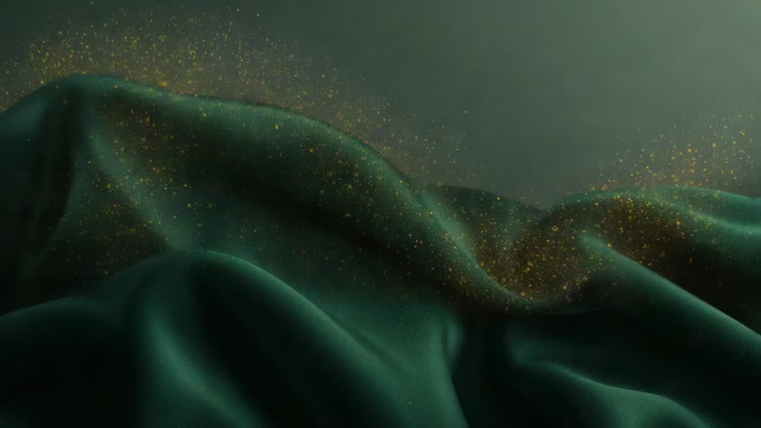 AI Generated Video. Showcasing close-up cinematic footage of emerald satin flowing, gold dust drifting across soft folds and catching studio highlights, creating luxurious shimmering texture. Delivering moody green color story with warm metallic accents, lending elegant high-end atmosphere. Serving as background for luxury product reveal, fashion runway title, beauty commercial, jewelry showcase, holiday promotion, and motion graphics overlays. Working well as looping ambient footage for website hero banners, social media reels, or presentation backdrops; slowing playback enhancing silky motion and glitter detail. Pairing with serif or minimalist sans-serif typography and warm gold color palette for cohesive branding and promotional campaigns.