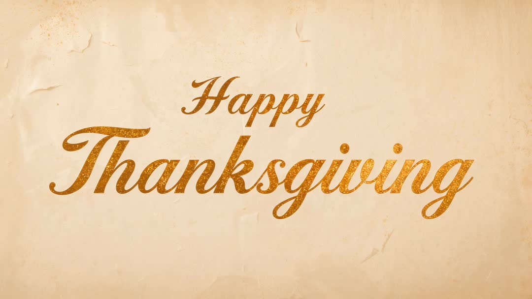 AI Generated Image. Video showing shimmering gold script Happy Thanksgiving lettering flickering over vintage parchment background with glitter texture and subtle paper creases. Typography animation featuring warm amber tones, soft vignette, and gentle shimmer highlights, creating nostalgic holiday mood. Looping motion graphics designed for seamless repeat and slow fade transitions, delivering elegant reveal for title sequences. Ideal for holiday video intros, social media reels, e-cards, invitation openers, retail signage, website hero headers, email campaign banners, and TV spots. Text layers remaining editable for color, size, and timing adjustments; overlaying logo or call-to-action integrating smoothly. Recommended uses include seasonal marketing, family greeting messages, restaurant promotions, community event announcements, and Thanksgiving-themed presentations.