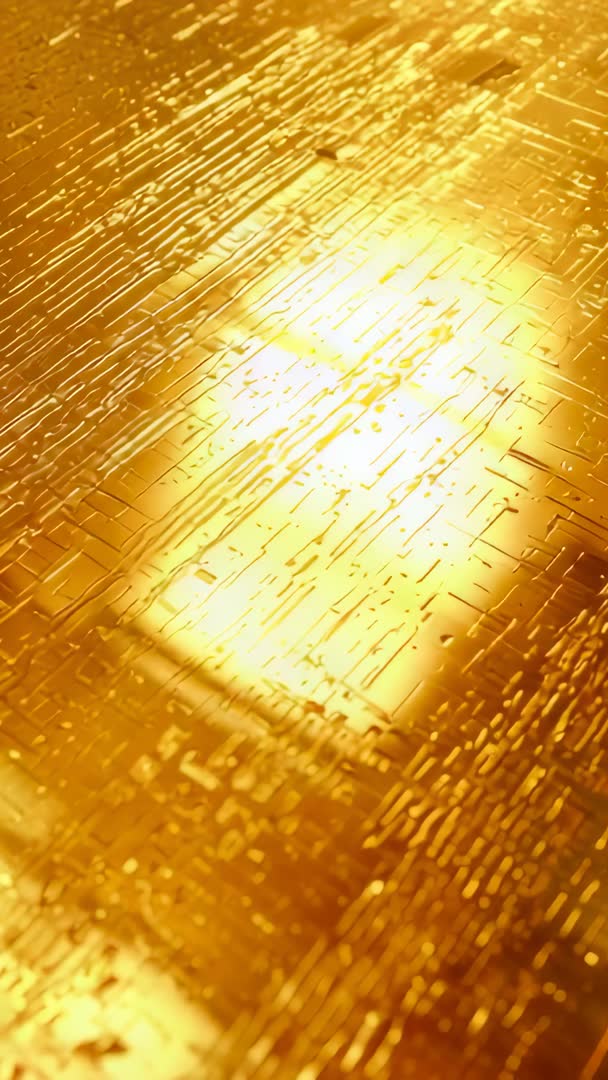 AI Generated Image. Video showing close-up of textured gold panel featuring shifting rectangular highlight and scattered droplets. Surface catching moving light and creating shimmering specular reflections across grooved pattern. Loop-friendly vertical composition ideal for mobile screens, social stories, and digital signage. Use for luxury branding backgrounds, product promo intros, title sequences, music visualizers, website hero banners, and animated wallpaper. Add overlay text, logo, or color grading to match brand palette. Pair with slow ambient soundtrack for premium, cinematic mood.