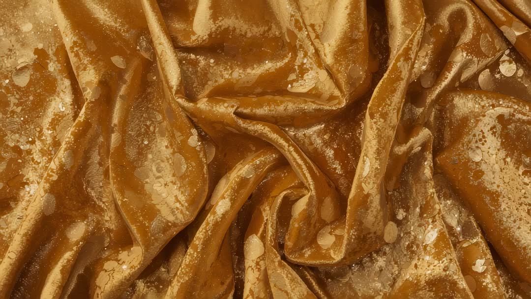 AI Generated Image. Featuring close-up clip of draped golden velvet shifting under warm light, revealing glossy folds and speckled highlights. Capturing slow flowing motion and high-contrast shimmer, providing rich amber and bronze tones ideal for luxury branding and fashion video projects. Working well as elegant moving background for title sequences, product showcase backdrops, mood boards, social media loops, and textile design presentations. Suggesting color grade tweaks, gentle slow-motion playback, and soft vignette to emphasize texture. Delivering loopable footage suitable for 4K editing, motion graphics overlays, and seamless transitions for cinematic commercial work.