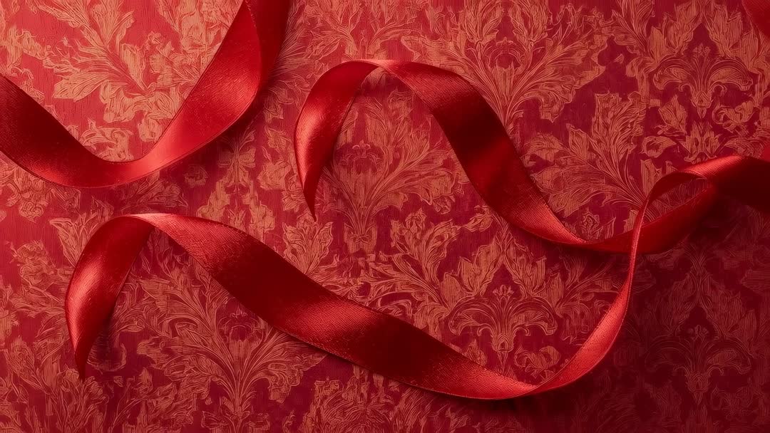 AI Generated Video. Video showing shimmering red satin ribbon gently curling and flowing across red damask fabric. Close-up footage highlighting glossy sheen, silk texture, and ornate floral pattern. Slow motion loop suiting opening sequences, product packaging promos, Valentine and holiday campaigns, banner backgrounds, social media reels, and romantic or luxury branding. Clip supporting overlaying text or logo reveal, color grading for warm mood, and cropping into horizontal or vertical formats. Working well for greeting card animations, gift wrap tutorials, e-commerce hero banners, floral boutique ads, and seasonal advertising.