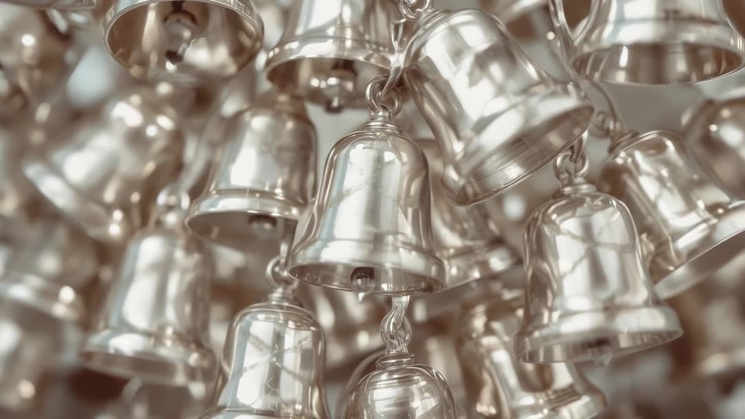 AI Generated Video. Video showing camera moving in on cluster of polished silver bells, bells gently swaying and clappers tapping under soft studio light. Tight macro framing creating shallow depth of field and creamy bokeh, metal surfaces reflecting highlights and environment. Footage working well for holiday promotions, greeting card animations, title sequences, product commercials, social media reels, and mood-driven background loops. Clip offering loopable motion and clear focal point for adding chime or ambient sound effects. Creative uses including overlay for festive typography, background for music videos, texture for luxury packaging mockups, and visual element for seasonal websites. Editing tips: slow ramping zoom, warm color grade, subtle audio of bells to enhance emotional impact.