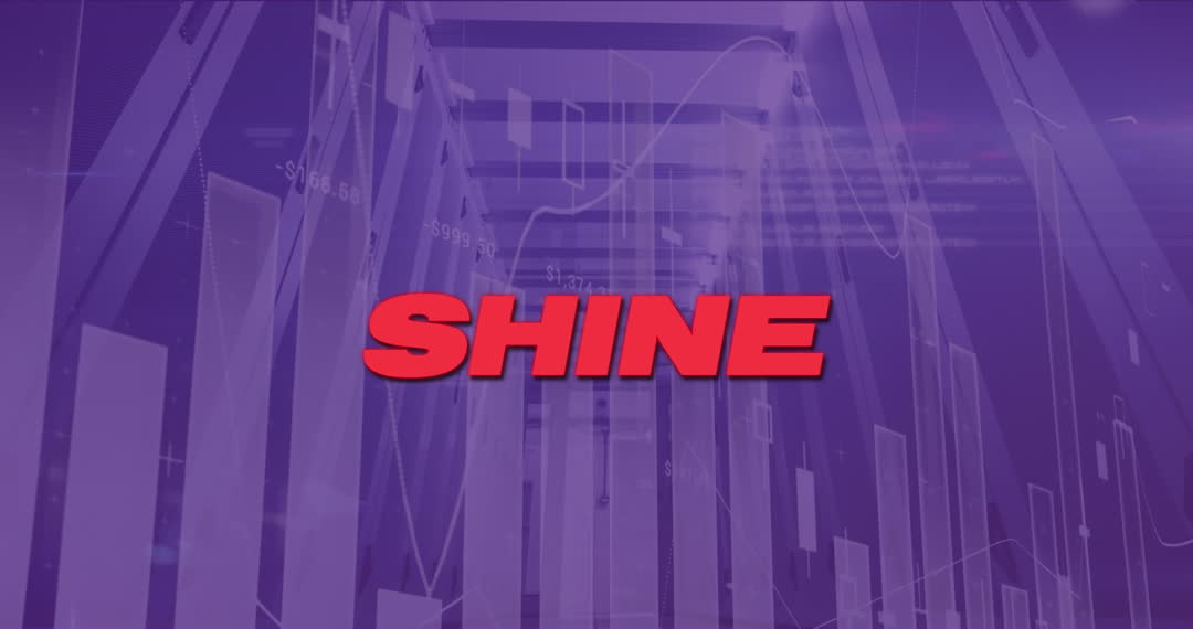 A vibrant visual featuring bold 'Shine' text overlaid on animated data processing visuals within the backdrop of a high-tech server room. Sleek geometric lines and charts convey a sense of rapid digital information exchange. Ideal for tech company banners, presentations on digital innovation, or visual content for networking conferences.