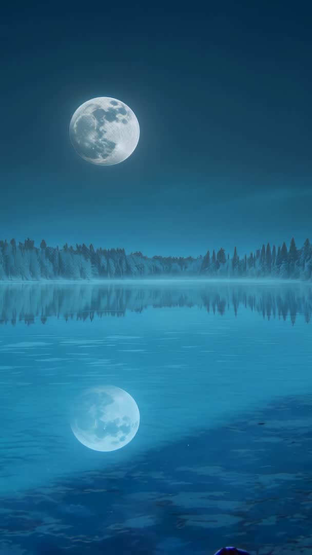AI Generated Image. Vertical video showing shining full moon reflecting on calm lake with gentle ripples and misty forest shoreline. Scene presenting tranquil nocturnal landscape with soft blue tones, evoking calm, mystery, romance. Ideal for social media stories, mobile wallpapers, meditation app backgrounds, music video overlays, book or album covers, travel and nature promos, website hero sections. Composition offering ample negative space for text overlays, titles, motion graphic elements. Loop-friendly footage with subtle water wobble providing natural motion for ambient or relaxation content.