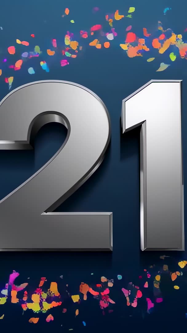 AI Generated Video. Vertical motion graphic zooming on silver 3D number 21 shining on dark blue background as multicolor confetti floating and falling across frame. Strong metallic reflections and soft shadows adding depth while vibrant confetti pieces introducing celebratory energy and color contrast. Suiting milestone content such as birthday greetings, anniversary announcements, 21st party promos, event countdowns, social media stories, and reels. Offering loopable playback and optimizing for 9:16 vertical delivery, allowing easy overlay of logo and headline in lower or center-safe areas. Color palette and premium finish creating luxury branding vibe for corporate celebrations, lifestyle campaigns, and promotional ads. Delivering instant recognition of milestone number while preserving room for custom text, sound design, or animated transitions.