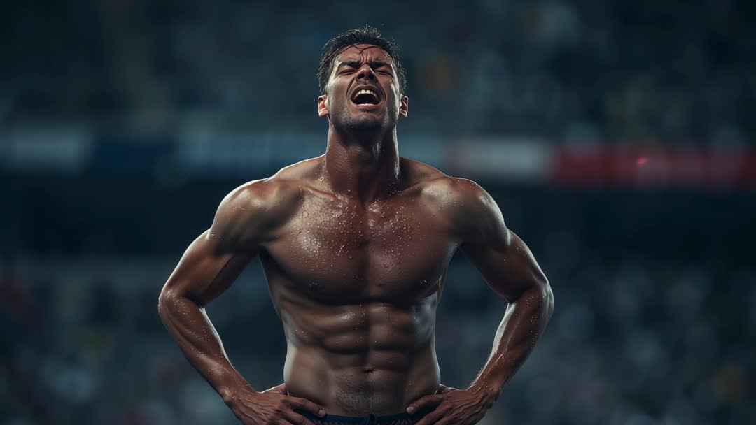 AI Generated Image. Video clip showing shirtless male athlete panting and catching breath after explosive sprint, sweat glistening across chiseled torso under dramatic stadium lighting. Crowd remaining blurred, placing focus on physical strain, facial grit, and muscle definition. Suiting fitness advertising, gym branding, sports broadcast intros, workout app promos, supplement packaging, and motivational social media campaigns. Working well as background for title sequences, slow-motion replays, or training montage, allowing designers to add text overlays, logos, or color grading. Offering strong emotional hook for themes of determination, comeback, peak performance, and athlete storytelling.
