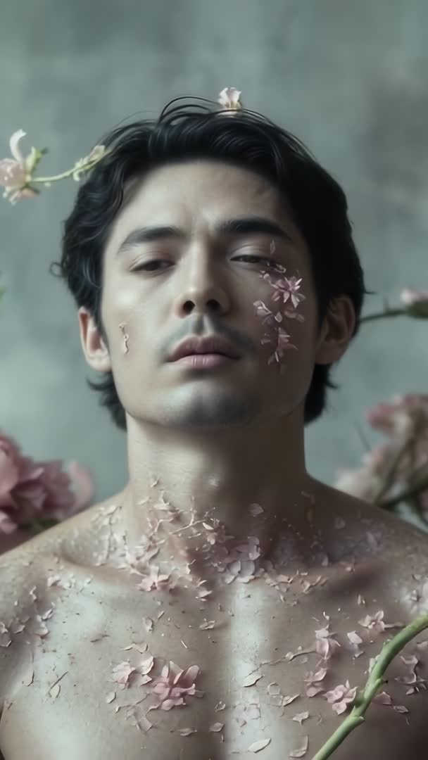 AI Generated Image. Vertical clip showcasing shirtless man with delicate pink petals settling across face, neck, chest while branches swaying gently against soft neutral backdrop. Composition focusing on meditative expression and minimal botanical detail, creating calm, introspective mood. Lighting emphasizing skin texture and petal detail, delivering cinematic shallow depth of field. Suiting wellness and skincare campaigns, spa and meditation app promos, beauty and grooming editorials, social media reels and vertical ads, mood-setting background for music videos and contemporary art projects. Licensing suggestions including lifestyle brands, editorial features on mental health and self care, creative advertising and beauty product launches. Framing optimized for mobile fullscreen use, portrait cropping for reels and stories, offering flexible clips for teaser trailers, hero banners, and brand storytelling.
